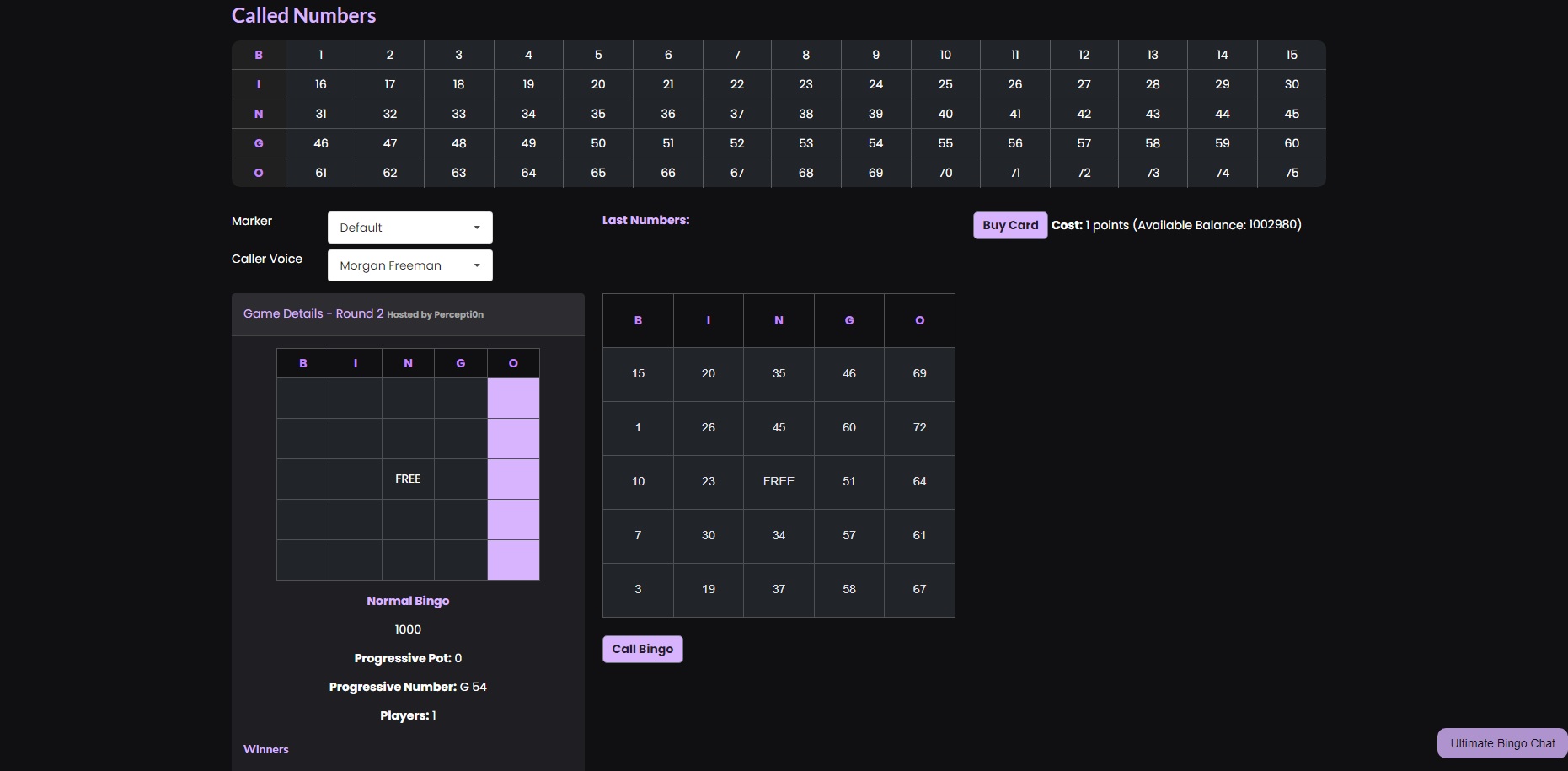 Ultimate Bingo is a multiplayer web-based bingo game where games are facilitated by a host. The host logs into a game manager area, chooses a pattern each round and waits for someone to get a bingo. Ubuntu Linux, Node.js, PHP/MySQL, and Bootstrap were the primary technologies used.